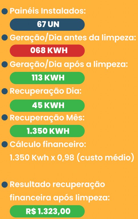 Assim, a sujeira que se acumula com o tempo é retirada e não haverá obstáculos que impeçam a chegada dos raios solares diretamente aos painéis.